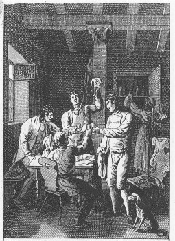 Er dürfte wesentlich früher zu Bett gegangen sein, vor allem im Winter, denn die Räume waren schlecht beheizt und nur spärlich erleuchtet. Die große Zahl der Bier- und Weinhäuser - neben den Straußenwirtschaften gab es in Lahr auf etwa 5000 Einwohner über 30 Wirtshäuser - läßt den Schluß zu, daß die Männer - beileibe nicht die Frauen oder nur die "ganz schlechten" - häufig bis zur Feierabendglocke ins Wirtshaus gingen. Sie tranken das in Lahr gebraute und im Felsenkeller kühl gelagerte Bier frisch vom Faß und ließen sich auch den heimischen Wein munden, doch nicht nur diesen, die Wirte, die oft auch Weinhändler waren, verfügten immer auch über ein gutes Sortiment an Kaiserstühler oder Affentaler Weinen, und auch solchen aus Burgund und Bordeaux. Der Zuckerbäcker Caspar, der sich Cafetier nannte und im Billardzimmer ein Kränzchen - für Männer - hielt, schenkte auch Liköre und Champagner aus.
