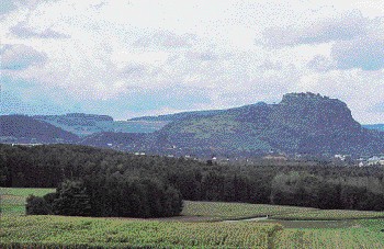 maß einer sanft geschwungenen Hügellandschaft steil die Silhouetten von sieben Vulkankegeln empor. Wie Eifel und Harz sind auch diese einst feuerspeienden Schlote vor rund 60 Millionen Jahren im Tertiär entstanden. Längst zu Stein (Basalt und Phonolith) erstarrt, wirken sie heute wie ein Amphitheater der Erdgeschichte.