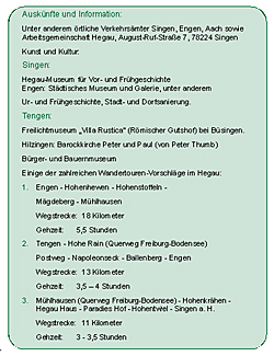 Suchten sich die Schulkinder früher im Heimatkundeunterricht einige der Städte im Hegau einzuprägen, half eine Eselsbrücke: "Engen, Tengen, Blumenfeld sind die schönsten Städt der Welt." Bereits dies eine leichte Übertreibung, wurde dem ein von Lokalkolorit geprägter Nachsatz angefügt: "Doch wär Aach nicht mit dabei, wär es nichts mit allen drei." Will heißen, daß es neben Burgen und schönen Städtchen noch manch anderes Schöne zu entdecken gibt, worauf die Bewohner des Hegau mit Recht stolz sind.