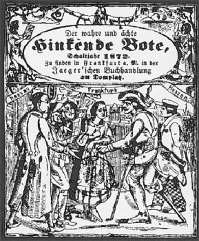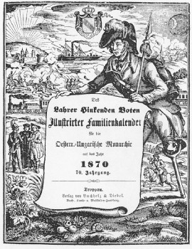 Geiger dankte es ihnen mit vorzüglichen Reisebeschreibungen und Landkarten, mit denen der Kalender zwanzig Jahre lang die Badener mit dem eben erst unter Napoleon zu einem zusammenhängenden Gebiet zusammengefügten und enorm vergrößerten neuen Land Baden vertraut machte. Und der "Lahrer Hinkende Bote" blühte auf: schon 1813 hatte er eine Auflage von 20.000 Exemplaren, und während 1845 der erste seiner Basler Konkurrenten einging, steuerte er auf seinen Höhepunkt zu: nach 1850 erreichte er die geradezu unglaubliche Auflage von mehr als einer halben Million Exemplaren, in den 70er Jahren bis zu einer Million und wurde "der erfolgreichste Kalender überhaupt" mit Lizenzausgaben für ferne Gebiete und mit einem großen Abnehmerkreis in Amerika. Auch äußerlich wurde er immer ansehnlicher und selbstbewußter: im Umfang stand er dem Basler "Hinkenden Boten" bald nicht mehr nach, 1812 erhielt er den offiziellen Titel "Der Lahrer Hinkende Bote oder Historisches Lesebuch für den Bürger und Landmann", 1814 bekam er ein eigenes markantes Gesicht durch ein neues Titelblatt mit dem bis heute charakteristischen gebogenen Schriftband. Zwar wurde seine altertümliche Ausrüstung mit Botenstab (statt einem einfachen Wanderstock) und Schnecke erst 1825 komplettiert, doch kamen umgekehrt bald Dampfschiff und Eisenbahn dazu, und überhaupt bemühte sich der Lahrer Hinkende mehr und erfolgreicher als seine meisten Konkurrenten darum, seine treue Leserschaft mit neuen Erfindungen und modernen Gedanken unmerklich vertraut zu machen und so auf die Höhe der Zeit zu bringen. Nur mit der herkömmlichen Aderlass-Tafel machte er kurzen Prozeß: erst wird sie 1810 ironisch kommentiert; 1812 fehlt sie bereits ersatzlos! Und das behutsame Bemühen um Modernität wurde von seinen Lesern honoriert, anders als z.B. beim Berner Hinkenden Boten, dessen Leser noch am Ende des vorigen Jahrhunderts darauf beharrten, daß die herkömmlichen unsinnigen Wettervorhersagen weiterhin gedruckt werden mußten…