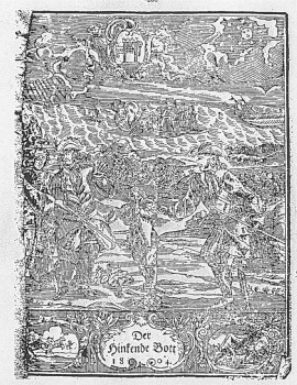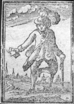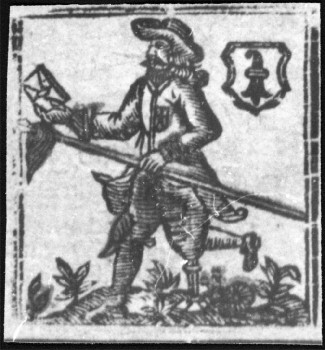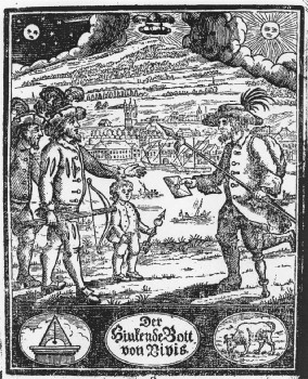 Damit ähnelt er dem Basler Hinkenden Boten zum Verwechseln: bis auf wenige abweichende Buchstaben hat er das Titelblatt des großen Vorbilds einfach abgekupfert, dazu noch keck das Wort "Neuer" durch "Vollkommener" ersetzt und seinen Verlag statt den Basler daruntergesetzt. Sogar der angebliche Verfasser "Antoni Sorgmann" ist mit übernommen (er hätte allerdings sehr alt werden müssen, wenn er ein wirklicher Autor gewesen wäre: sein Name ziert schon im 17. Jh. die Titelblätter von Volkskalendern ...). Auch die Umschlagabbildung mit all den neugierig machenden Zutaten: dem Stelzfuß vor Seeschlacht, Unwetter, Krieg, Großbrand, lauerndem Krododil usw. hat er einfach nachschneiden lassen; bloß der Basler Bischofsstab ist durch das Stadtwappen von Lahr ersetzt. Lediglich am Umfang merkt man, daß Geiger noch vorsichtig kalkulieren muß: der neue Lahrer hat